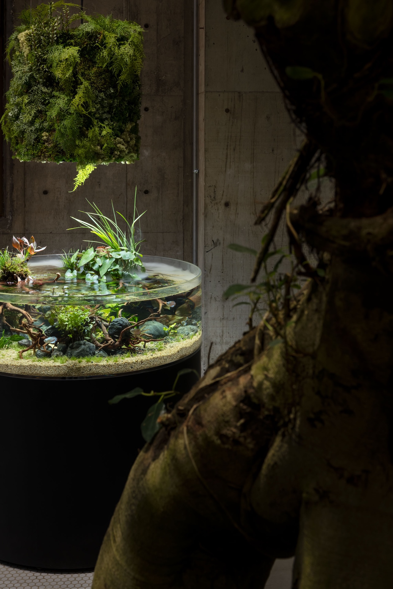 ネイチャーアクアリウムやパルダリウムをはじめ、水や霧を用いた様々な水景演出と、全国各地の天然石を用いて製作したオリジナルプロダクトの展示、壁や天井に特殊な造形を施したグリーン演出などを間近でご覧頂けます。