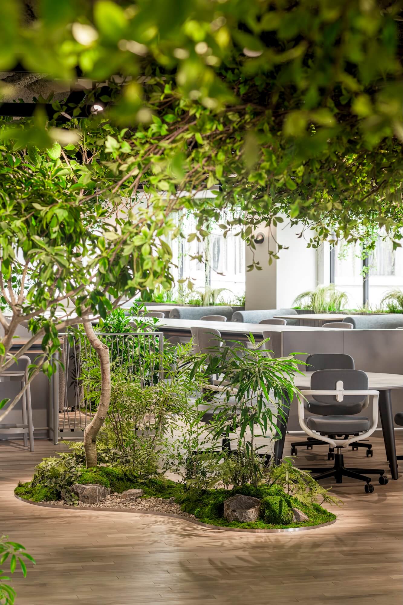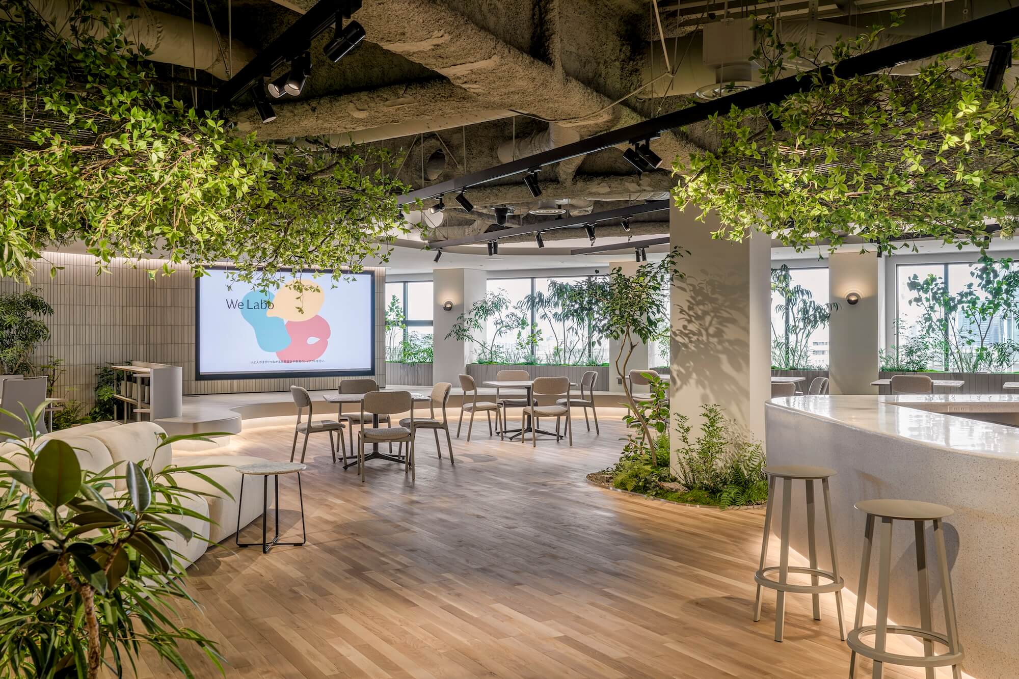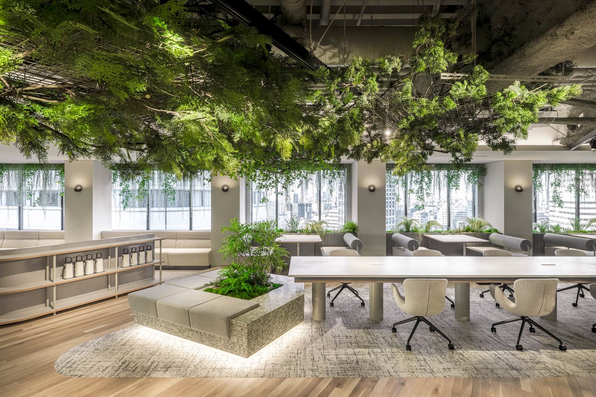 床に施した植栽のモールディングと融合し、そこが屋内であることを忘れてしまうような、良い意味でスケールアウトした演出となっている。
