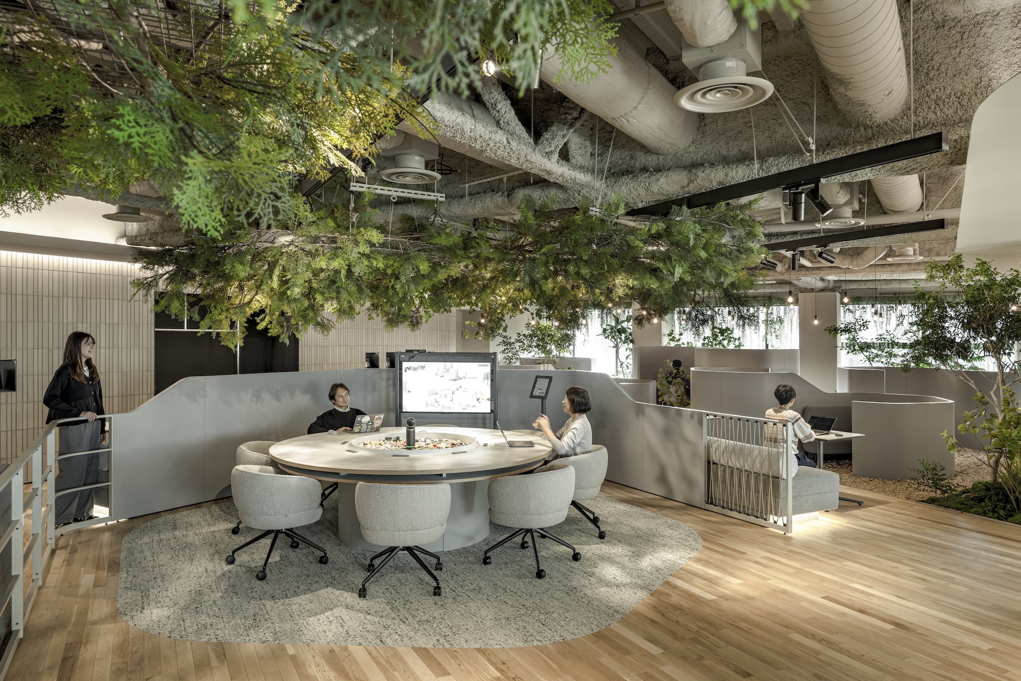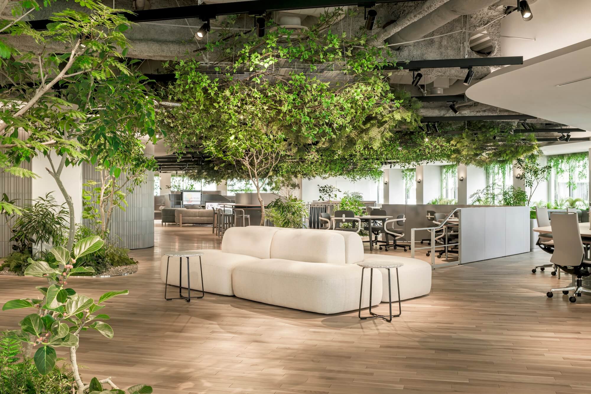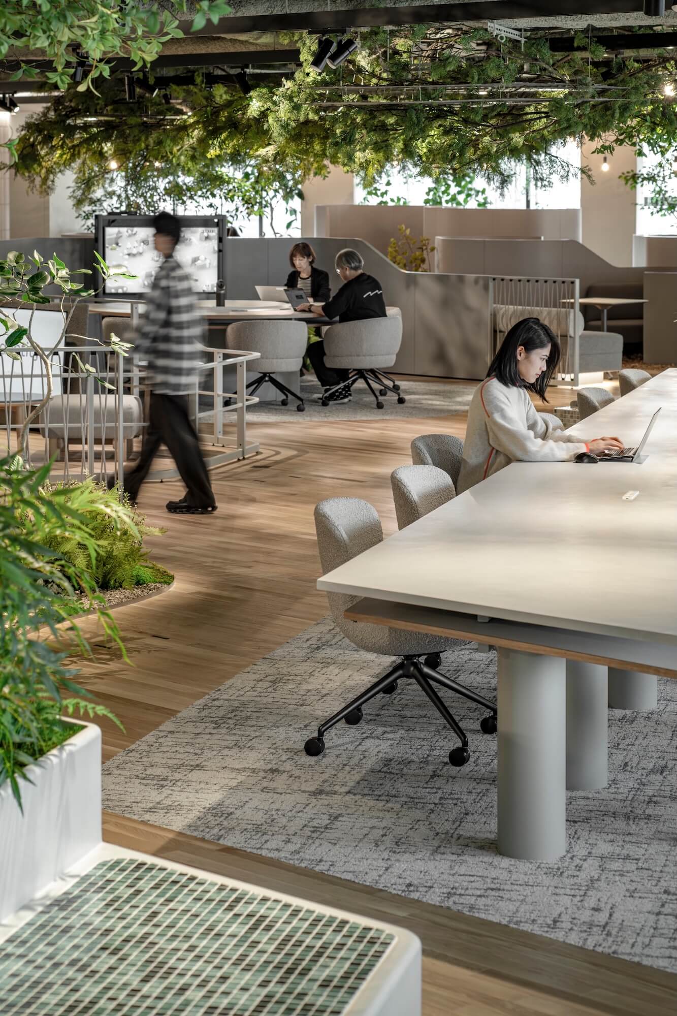 床に施した植栽のモールディングと融合し、そこが屋内であることを忘れてしまうような、良い意味でスケールアウトした演出となっている。