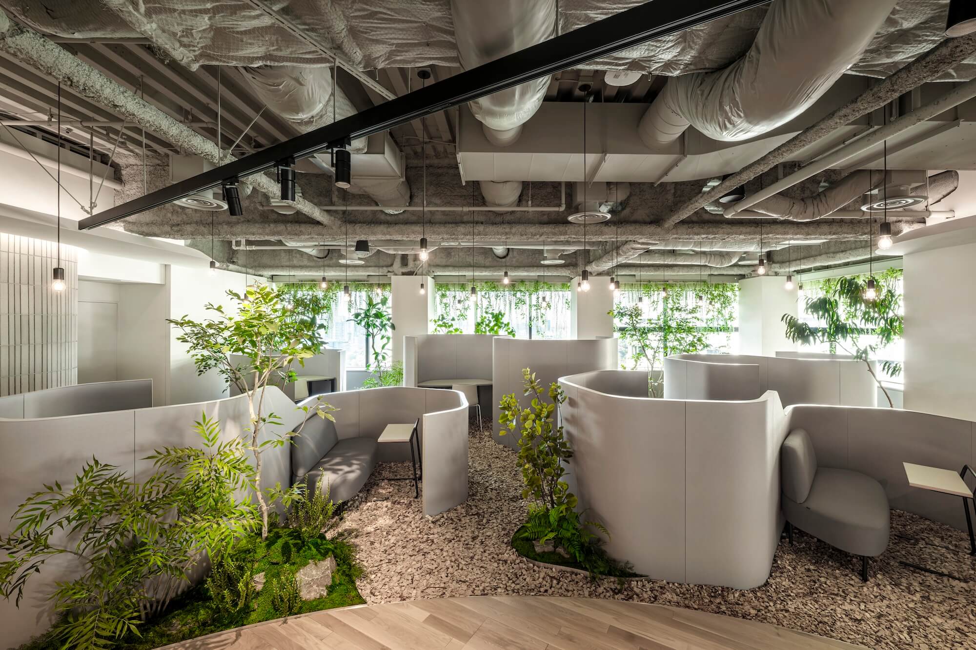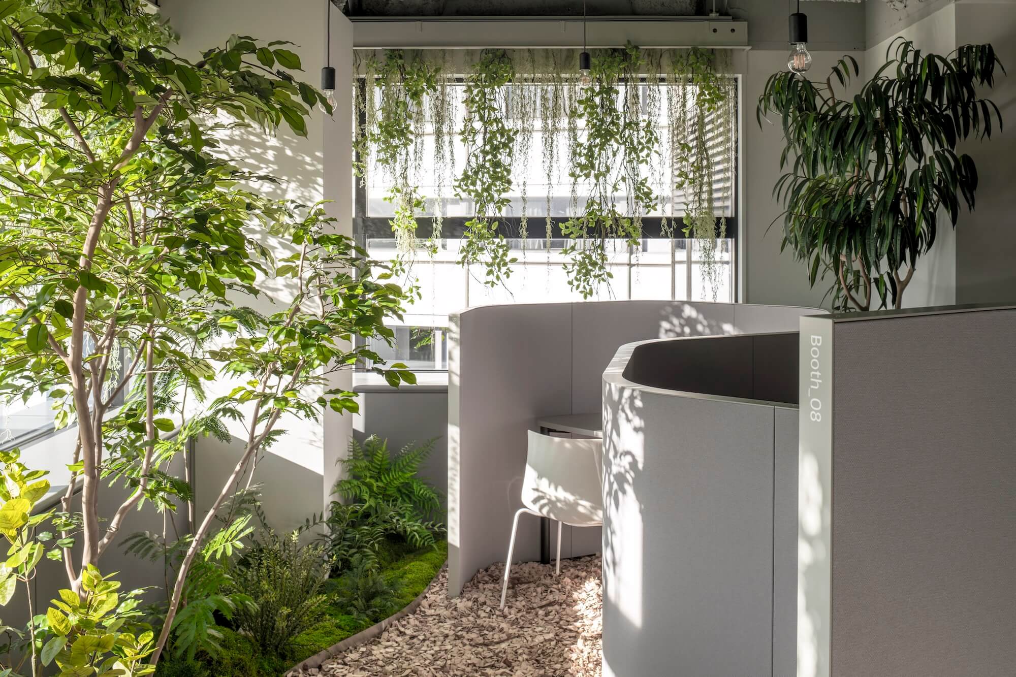 空間を柔らかく包み込みながら落ち着きを与え、グリーンを介してあふれる光は、木漏れ日のような優しいきらめきを感じさせる。